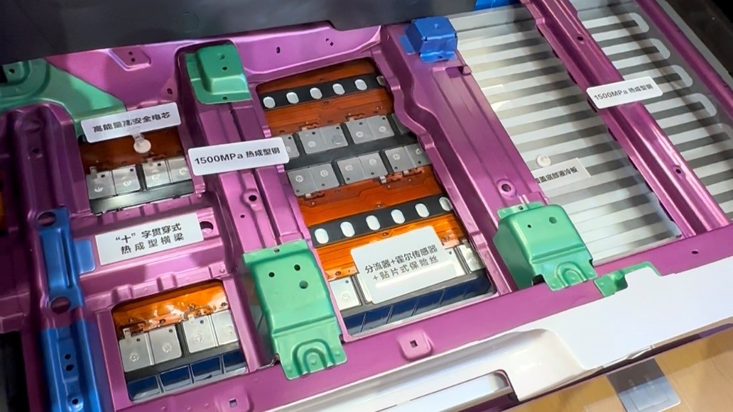 在2024年廣州國際車展上展出的鉑智3X動力電池系統(tǒng),從中可見目字型動力電池防護框架和1500兆帕超高強度熱成型鋼材