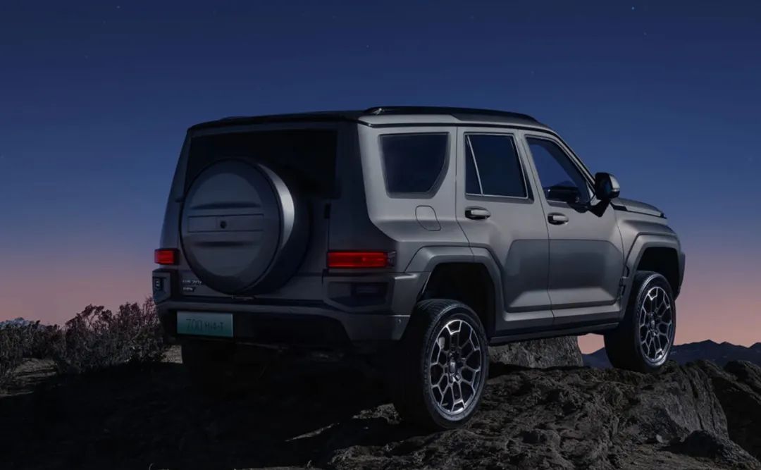 車尾同樣采用了方正的造型規劃,并裝配了后懸掛備胎,進一步增強了硬派越野的氣息,車頂末端配備了高位剎車燈,兩側尾燈運用了狹長的設計風格,內部集成了兩根 LED 燈帶,點亮后辨識度極高。后包圍也安裝了寬大的護板,整體看上去十分硬朗。