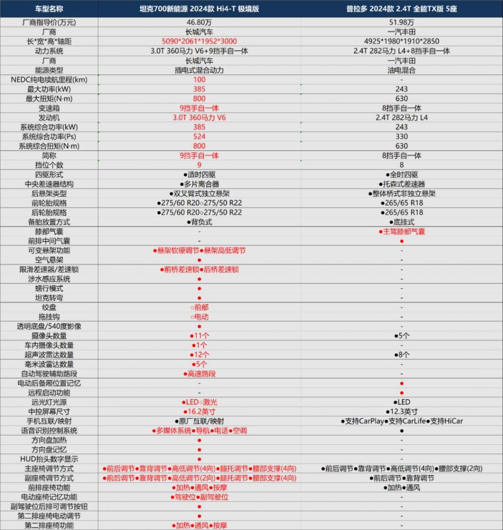 中大型SUV市場里不乏競爭者,不過,既然要對比,我們不妨選個標桿,綜合考慮市場格局,我們選擇傳統陣營的典型代表——官方指導價格為51.98萬元的豐田普拉多2024款2.4T全能TX版5座和官方指導價格為46.80萬元的坦克700新能源2024款Hi4-T極境版進行對比分析。