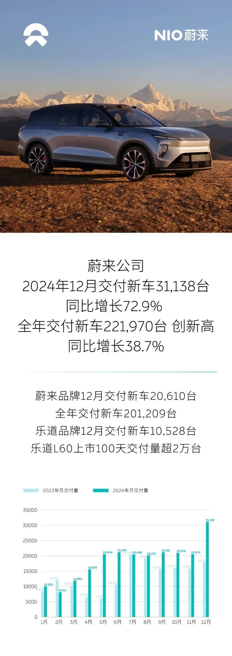 小鵬汽車,12月交付36695輛,全年累計(jì)交付190068輛。“深蹲起跳”的轉(zhuǎn)折點(diǎn),就在于推出了爆款車,一個(gè)是MONA M03,另一個(gè)是小鵬P7+看兩組數(shù)據(jù):12月,MONA M03交付超15000 輛;小鵬 P7+單月交付破萬。其實(shí),站上3萬輛的高崗,小鵬汽車既因?yàn)閯?chuàng)造出了“爆款”,也因?yàn)楫a(chǎn)能承接住了爆款,不然,易逝的流量恰如煙花一般,很容易一閃而過。2025年,小鵬汽車計(jì)劃完成36萬輛的銷量目標(biāo),“推新車”是主要的解題思路,期待其持續(xù)月銷跨過3萬輛了。