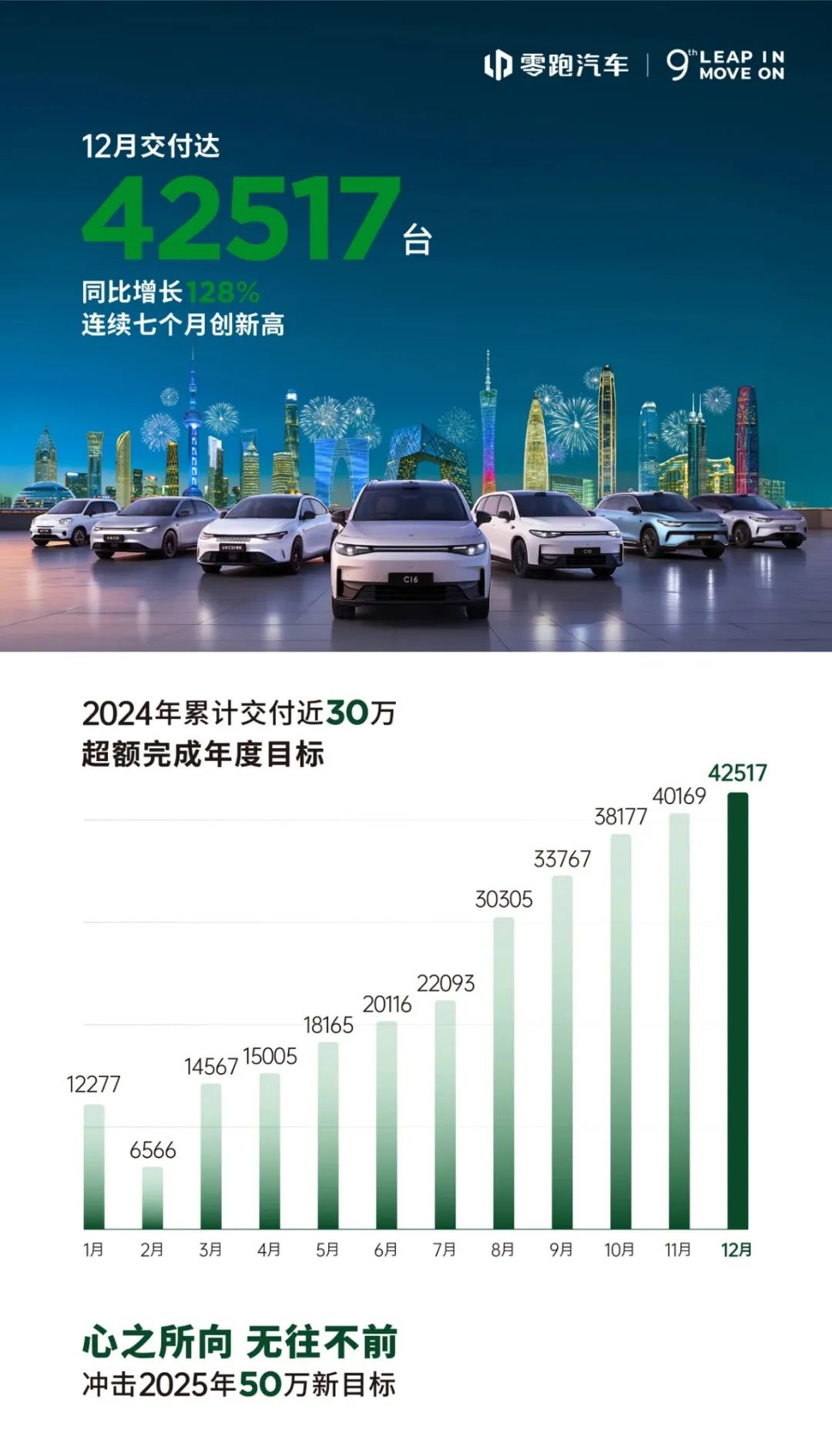 零跑汽車,吃到了“理想汽車”價(jià)格火力覆蓋之外的市場(chǎng)紅利,稱其為“小理想”,并不為過。12月,零跑汽車交付量為42517輛,同比增長(zhǎng)128%,全年累計(jì)交付293724輛。在這種勢(shì)頭之下,零跑汽車2025年計(jì)劃達(dá)成50萬輛的銷量目標(biāo)。零跑汽車手里的牌還不少,在廣州車展上亮相了B10,這是一款尺寸不大的SUV,同步面向于海外市場(chǎng)。而由此引出的B平臺(tái),還將有更多新車入列。快速出新車,又有Stellantis打通海外銷售渠道,零跑的銷量“天花板”還能繼續(xù)往上探一探。