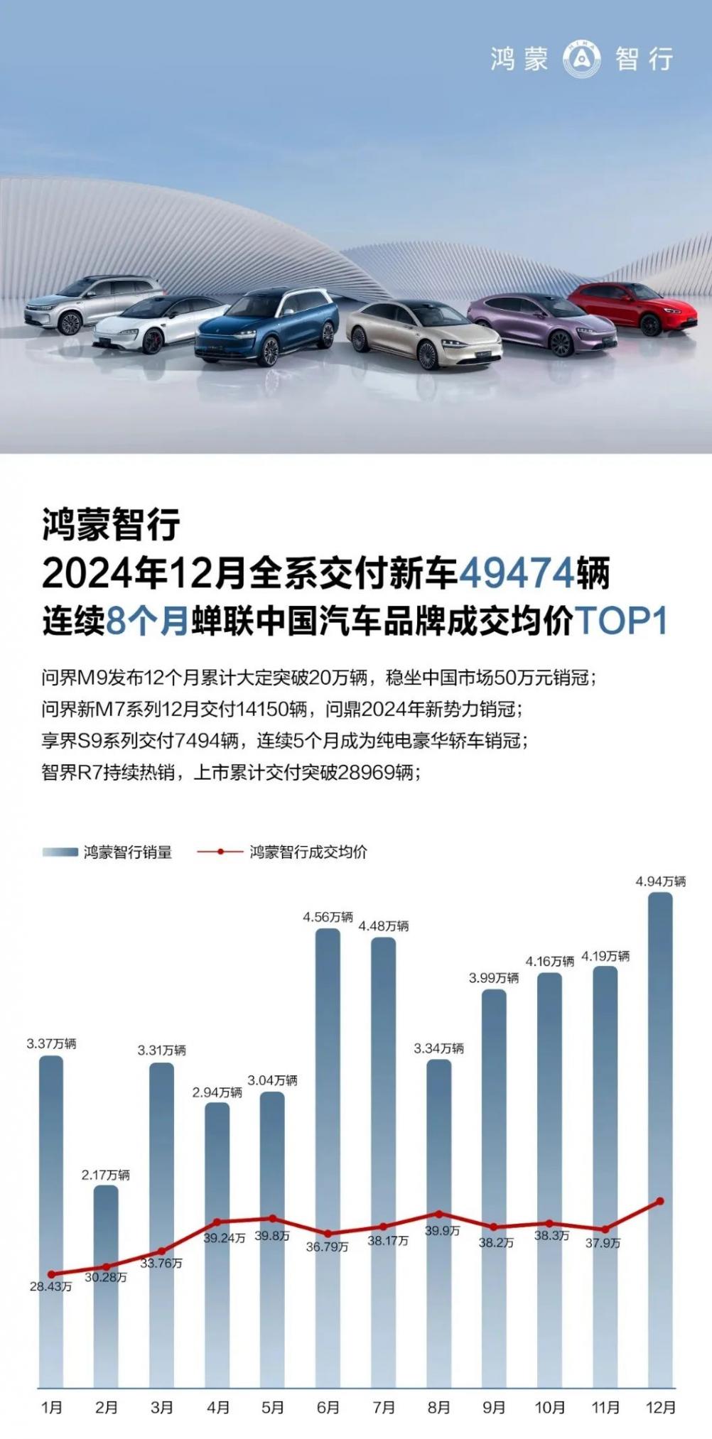 另一個(gè)不可忽視的角色,就是鴻蒙智行。12月,鴻蒙智行合計(jì)交付新車49474輛,全年銷量達(dá)到了444956輛,未完成年初定下的50萬輛銷售目標(biāo)。那么,2025年,鴻蒙智行計(jì)劃達(dá)成100萬輛的銷售目標(biāo),同樣充滿挑戰(zhàn)。從當(dāng)前“四個(gè)界”的表現(xiàn)來看,問界仍然是絕對(duì)的銷量大頭。像問界M9,12月累計(jì)大定超20萬輛;問界M7在12月份交付達(dá)14150輛。至于“其他界”,逐漸有了向好的跡象。比如,享界S9交付了7949輛,在這個(gè)價(jià)格段,表現(xiàn)不錯(cuò)了;智界R7僅有純電的時(shí)候,賣得已經(jīng)符合預(yù)期了,如今又有了增程動(dòng)力,銷量還會(huì)上一個(gè)新臺(tái)階。鴻蒙智行的宣傳攻勢(shì)無可挑剔,只是,有一個(gè)隱憂仍然存在,當(dāng)華為與諸多品牌結(jié)盟之后,其智能化能力將被快速?gòu)?fù)制,那么,“四個(gè)界”的差異化在哪里,或許,會(huì)一直拷問著鴻蒙智行。