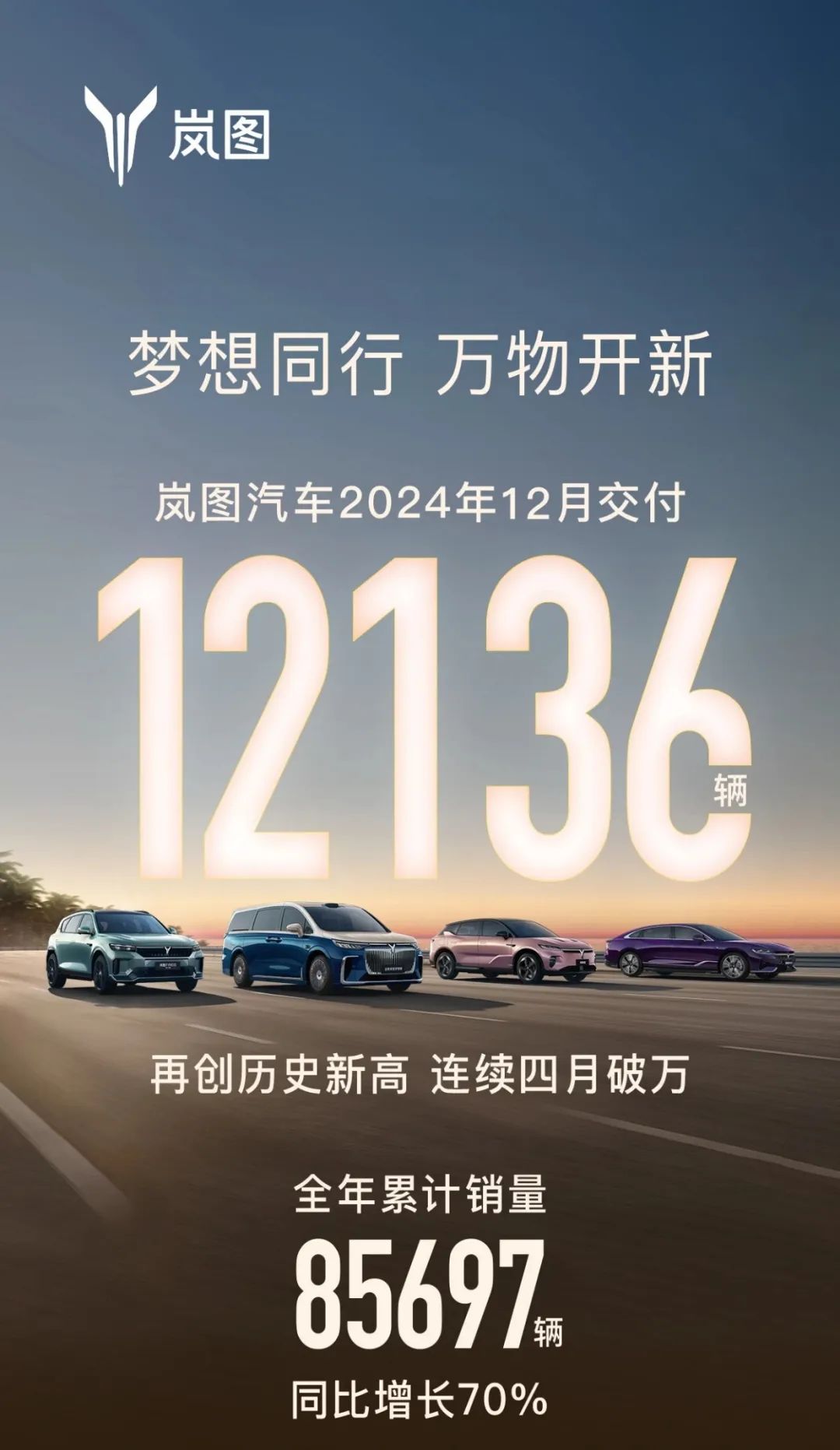 嵐圖,12月交付達(dá)12136輛,同比增長(zhǎng)21%。如此看,還在月銷萬輛的關(guān)口“做突圍”,但已經(jīng)創(chuàng)下了歷史新高。有意思的是,嵐圖夢(mèng)想家貢獻(xiàn)了大部分銷量,據(jù)說在12月單品破萬,在加入了華為乾崑智駕后,這款MPV的競(jìng)爭(zhēng)力提高了不少。相應(yīng)的,嵐圖FREE、嵐圖追光就顯得黯然失色了,以及嵐圖知音怎么了?為何沒有真正撐起嵐圖的銷量反攻之戰(zhàn)。2025年,嵐圖汽車需要找到新的機(jī)會(huì)點(diǎn)了。
