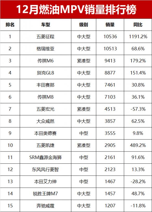 具體來看,12月份零售銷量破萬輛的燃油MPV共有兩款車型,包括五菱征程和豐田格瑞維亞,分別以10536輛和10513輛的銷量奪得12月燃油MPV銷量冠亞軍。