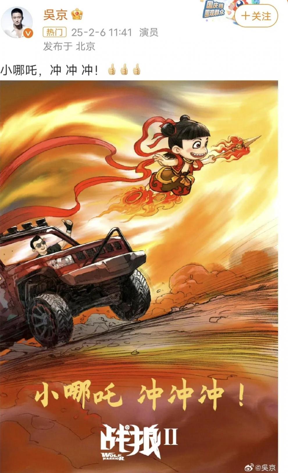 吳京在微博大方曬出特制海報(bào),一句“小哪吒,沖沖沖”飽含深情與祝福。海報(bào)中,《戰(zhàn)狼》里的冷鋒坐在車內(nèi),向飛馳在前的哪吒豎起大拇指,這一幕堪稱經(jīng)典。