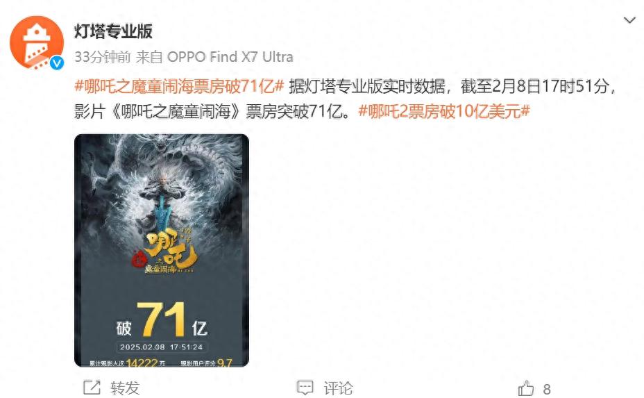 燈塔專業(yè)版實時數(shù)據(jù),截至2月8日17時51分,影片《哪吒之魔童鬧海》票房突破71億元。