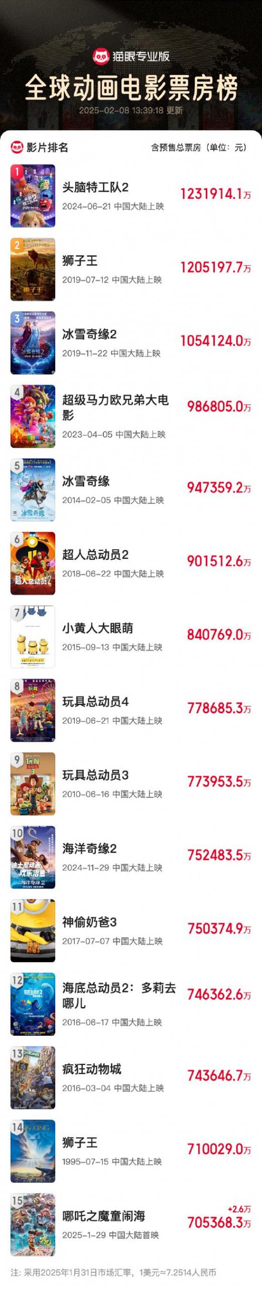 浪科技訊 2月8日下午消息,據(jù)貓眼專業(yè)版數(shù)據(jù),電影《哪吒之魔童鬧海》累計(jì)票房(含預(yù)售)超70.53億,進(jìn)入全球動(dòng)畫電影票房榜前十五。