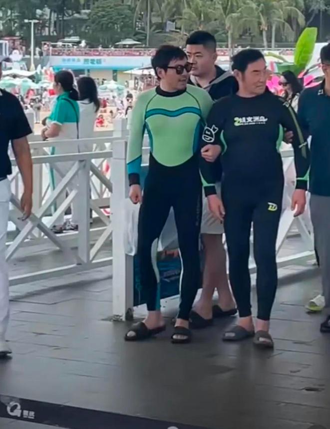 在三亞,沈騰和爸爸一起體驗了潛水運動。雖然潛水服很顯身材,但從照片看沈騰并沒有發福,依舊高瘦挺拔。不過爸爸年紀較大,走路有些踉蹌,需要他和朋友的攙扶。