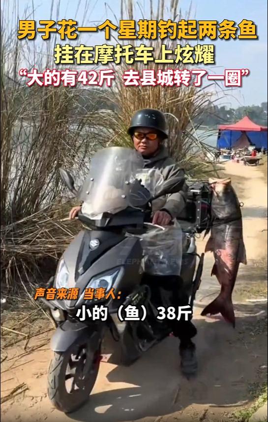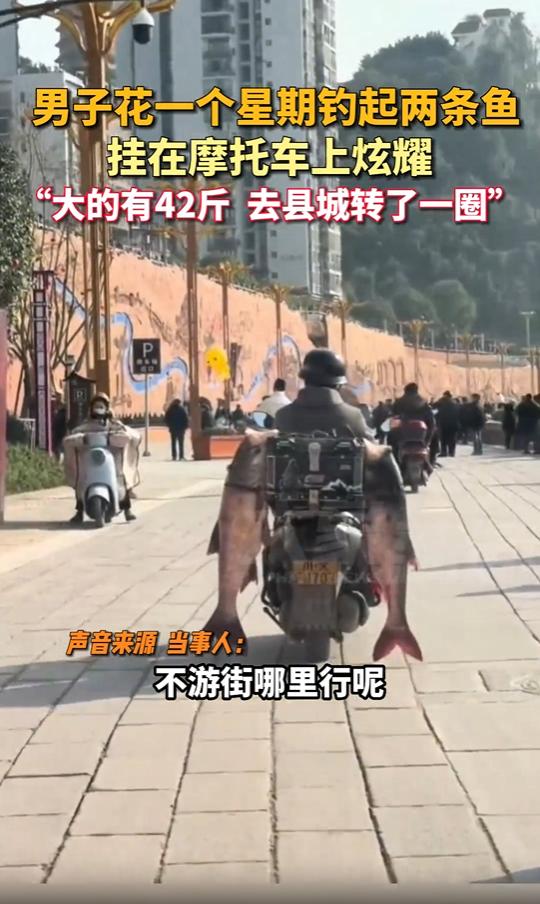 為了炫耀自己的釣魚成果,男子將這兩條大魚掛在了自己的摩托車上,并騎著摩托車在縣城里轉(zhuǎn)了一圈。