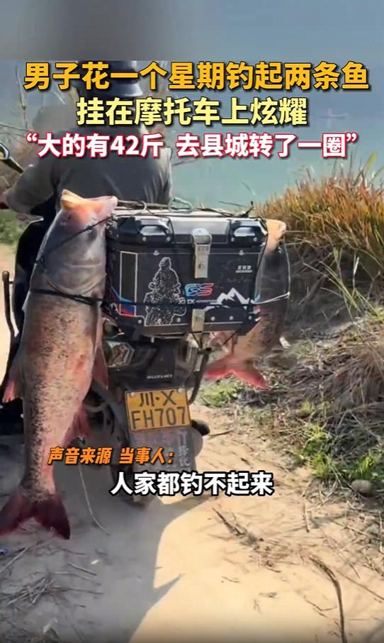 在四川廣安,一名男子花費了一個星期的時間成功釣起了兩條大魚,其中一條重達38斤,另一條更是達到了42斤。