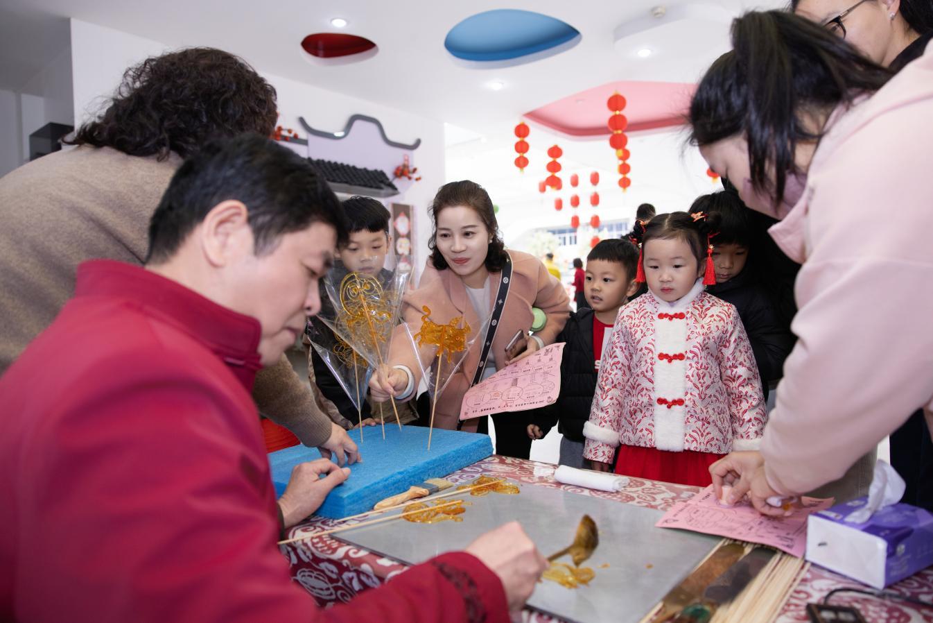 “福”字。美食坊內,南北年味香氣撲鼻——現包春卷、晶瑩湯圓、酥脆冰糖葫蘆吸引“小吃貨”們打卡品嘗。