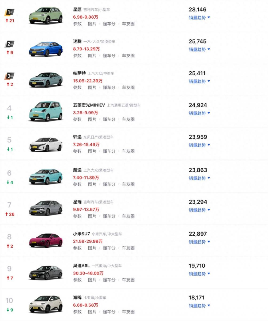 2025年1月轎車銷量前十盤點:小米SU7擠進前十,朗逸僅排第六