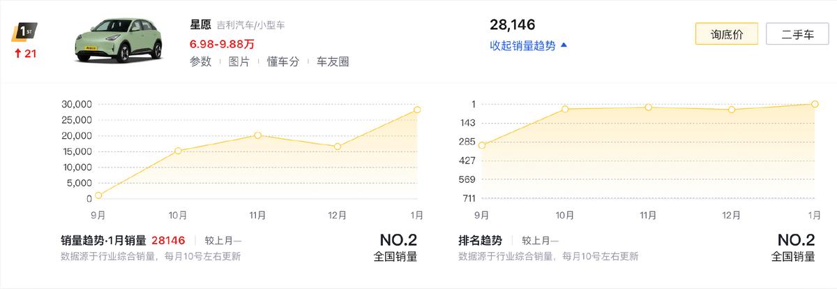 吉利去年推出的全新車型吉利星愿(28,146輛/第一名)拿下了1月的第一名,作為一款全新純電轎車,設計上的前衛與溫馨,能夠兼顧更多家庭的審美訴求,而且在全系10萬以內的情況下,它通過標配快充、Flyme Auto智能互聯、HiCar手機互聯等方式,響應了家庭與年輕用戶的核心訴求,讓全系皆能成為代步的新選擇。