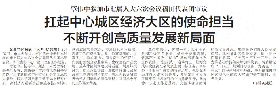 討論中,楊志華、顏杰、朱秀蘭等代表先后發言,紛紛表示市政府工作報告堅持以習近平新時代中國特色社會主義思想為指導,深入學習貫徹習近平總書記對廣東、深圳系列重要講話和重要指示精神,總結成績實事求是,提出目標科學精準,部署工作積極進取,是一份高舉旗幟、求真務實、凝心聚力、催人奮進的好報告。代表們圍繞金融業集聚、生物醫藥產業發展、重點片區規劃建設等話題,展開熱烈討論、提出意見建議。覃偉中感謝大家對政府工作的關注和支持,表示將認真研究吸納代表們提出的意見建議,共同把今年的工作謀深做實。