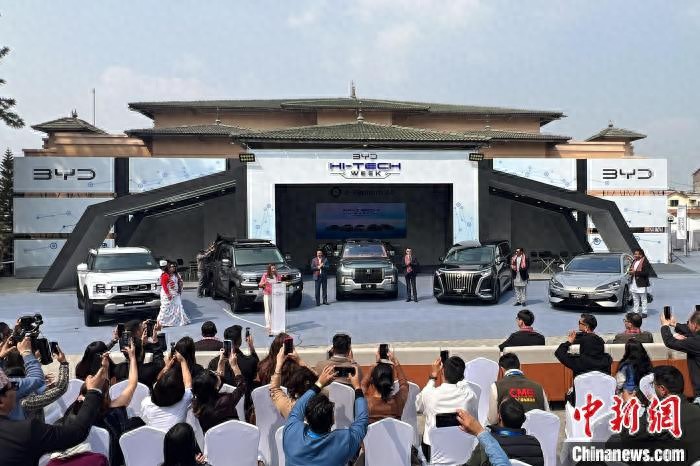 2月26日,中國新能源汽車品牌比亞迪旗下全品牌新能源車型在尼泊爾首都加德滿都集中亮相。中新社記者 崔楠 攝