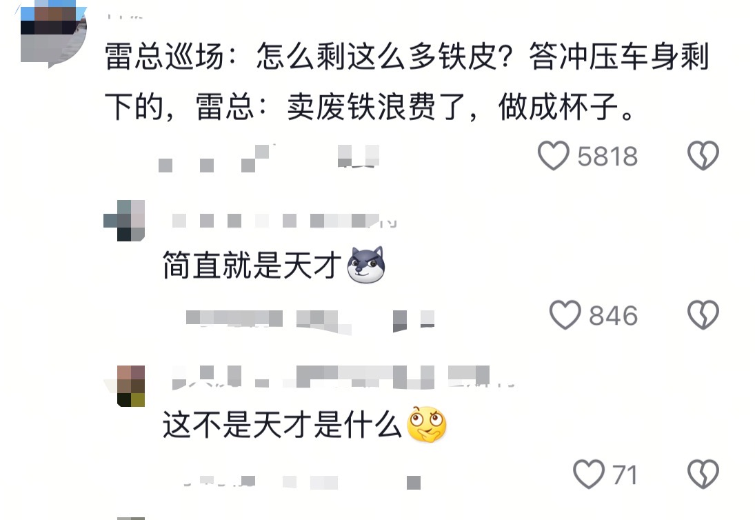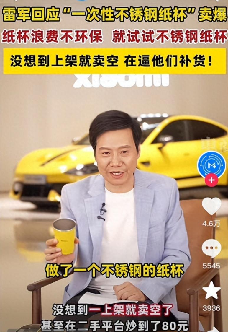 接著,工作人員又來(lái)了一句:“車(chē)板剩下了一些。”言下之意,仿佛這“不銹鋼紙杯”是利用汽車(chē)生產(chǎn)過(guò)程中剩余的材料制作而成。雷總則順勢(shì)接道:“一次性不銹鋼紙杯。”這樣的對(duì)話,讓整個(gè)場(chǎng)景充滿了趣味和戲劇性。
