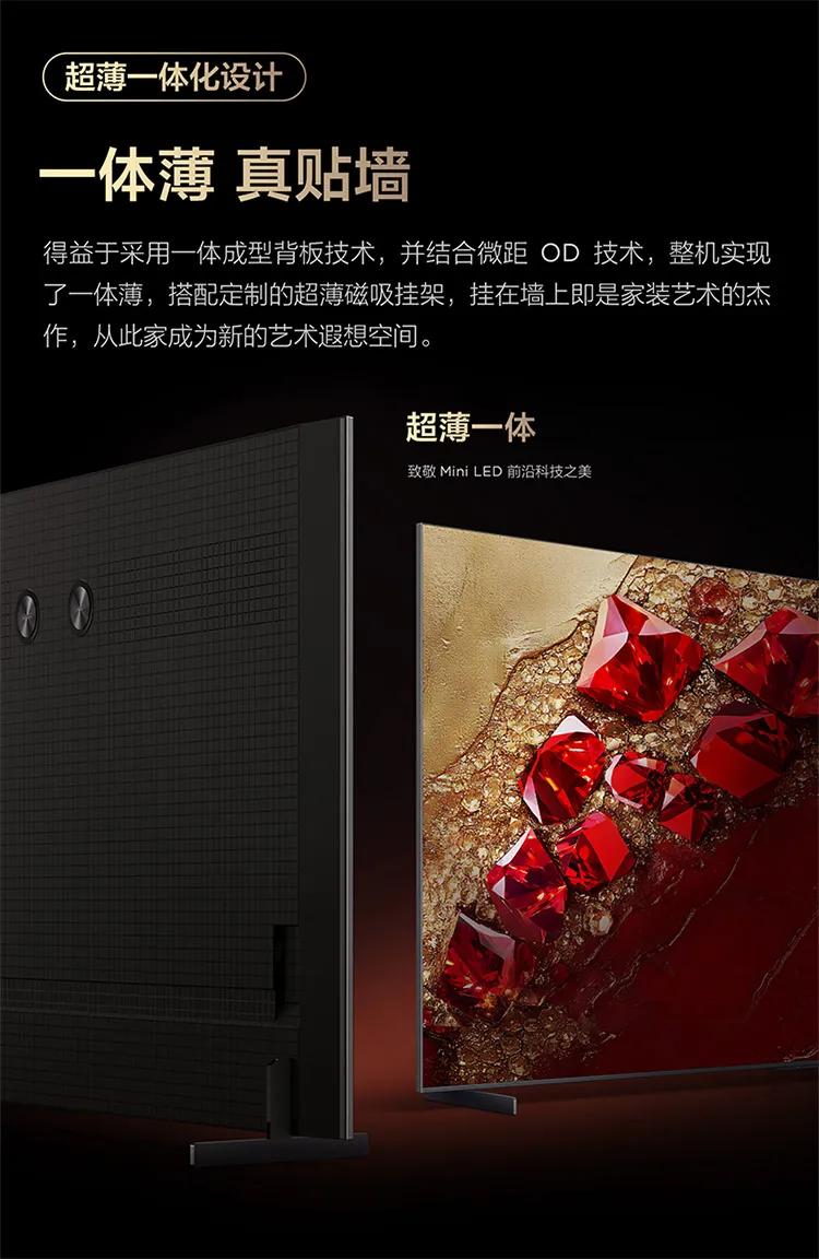 這款TCL C12K電視還是第四代液晶電視的代表作。經(jīng)歷了從第一代的寬邊框 + 厚黑邊,第二代窄邊框,到第三代的全面屏設(shè)計,電視外觀發(fā)展停滯了多年了。C12K 用極景·無黑邊外觀迎接了第四代無黑邊時代的到來。通過 22 項專利和航天級材料,將屏幕黑邊壓縮至 “肉眼不可見”,邊框厚度僅 2mm,能讓人感受全新的無邊電視美學(xué)。它整機最厚處不到 60mm,整臺電視側(cè)面看就像一塊平板,這種極薄一體化設(shè)計讓它無論是掛在墻上還是放在電視柜上,都給客廳帶來濃濃的科技美感。