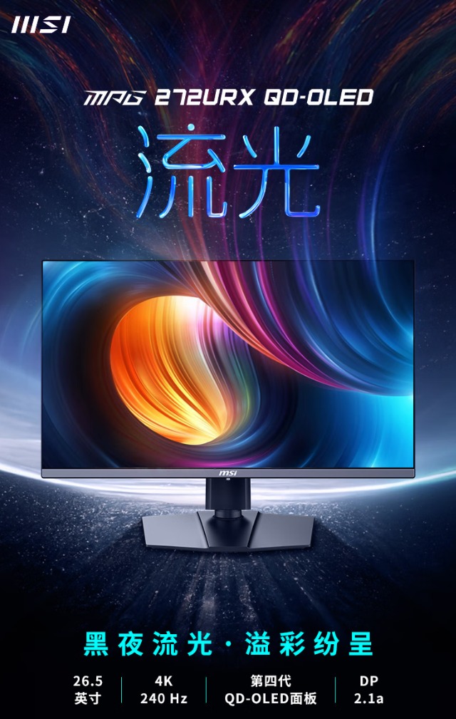 首先給大家介紹的是MPG 272URX QD-OLED顯示器,它采用了 26.5 英寸的三星新一代原廠 QD-OLED 面板,擁有 3840×2160 的 4K 分辨率,能夠呈現出細膩逼真的畫面細節。QD-OLED 技術通過藍光 OLED 激發量子點轉色膜上的紅光及綠光,相比傳統 OLED 面板具有更出色的色域表現,使得色彩更加鮮艷、逼真。