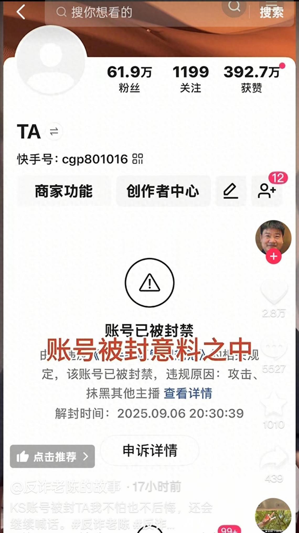 9月5日,多名網友反映,反詐老陳的快手賬號已被封禁。當晚,反詐老陳就此事在抖音發布視頻回應稱,自己賬號被封是意料之中的事情。