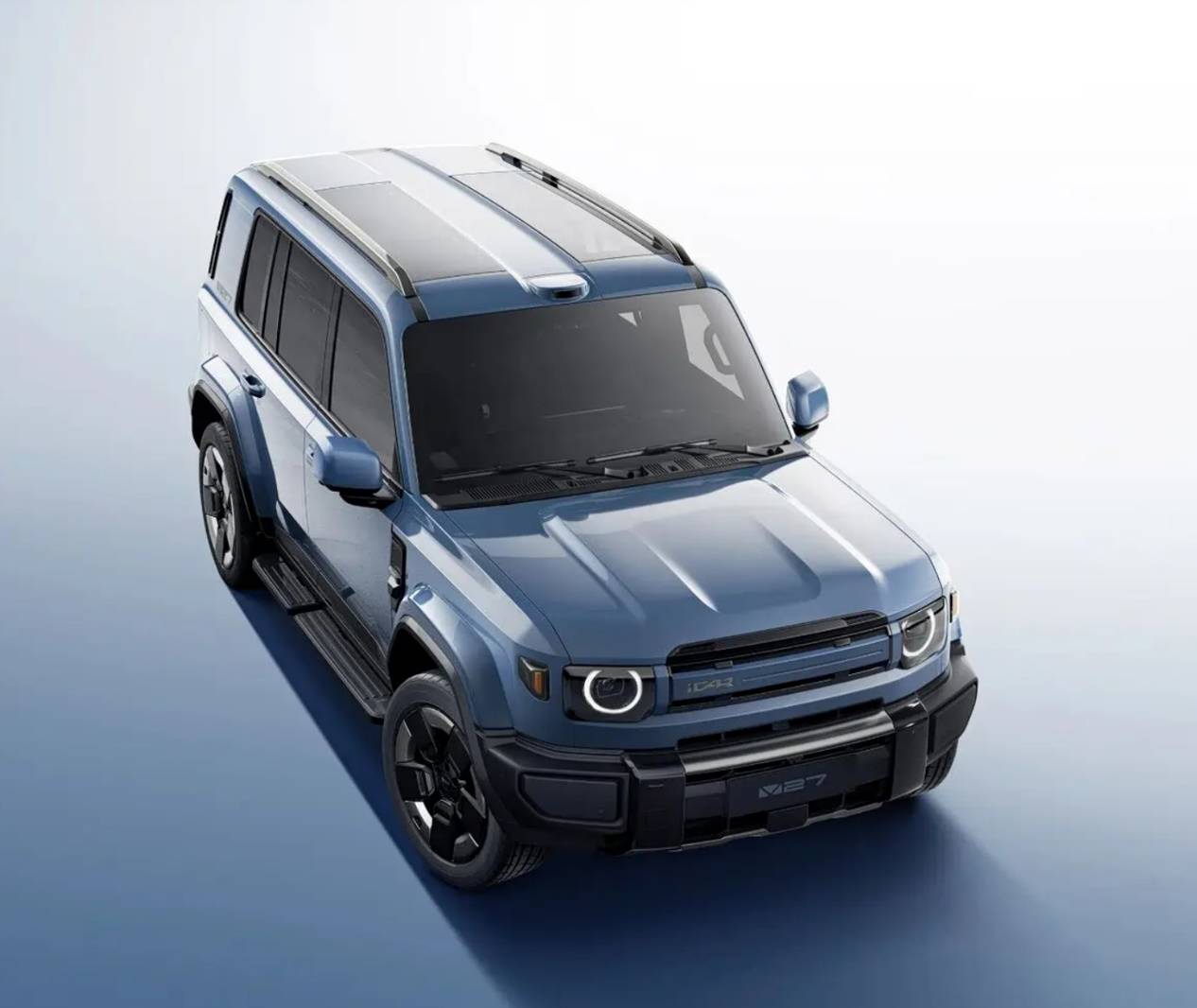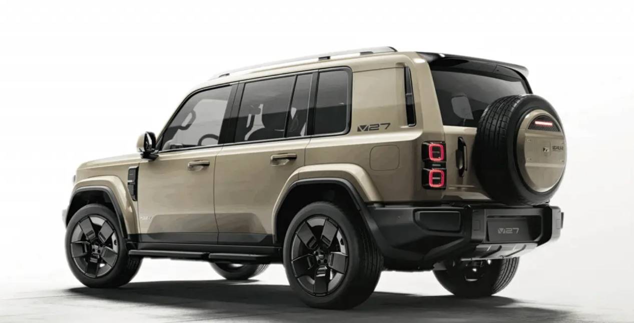 iCAR V27長寬高分別為4909(小書包版)/5055(備胎版)x 1976 x 1855/1894(帶行李架)mm,軸距為2910mm。這一尺寸讓iCAR V27在視覺效果上甚至可以媲美、路虎衛士等經典硬派SUV。