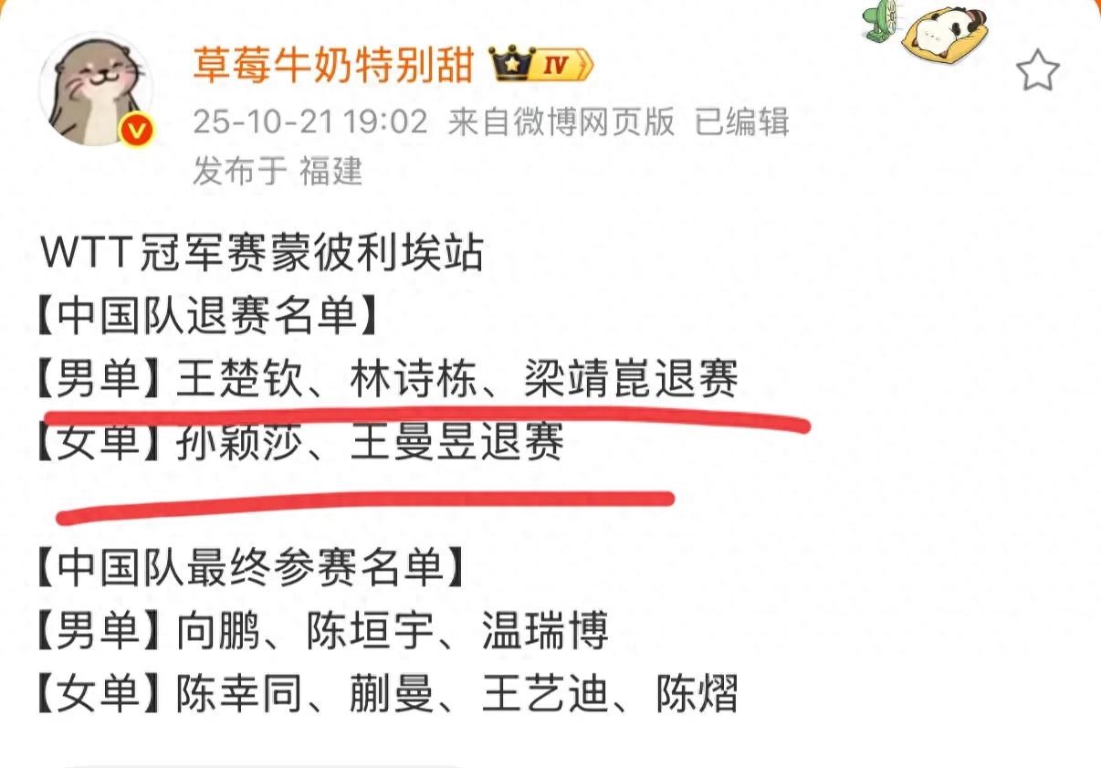 剛結(jié)束亞錦賽,運(yùn)動(dòng)員們的疲憊狀態(tài)都肉眼可見(jiàn),大家都在猜測(cè)教練組會(huì)不會(huì)讓他們休息兩站比賽,好好備戰(zhàn)11月初的全運(yùn)會(huì)呢?就在剛剛,WTT官網(wǎng)宣布了王楚欽、林詩(shī)棟、梁靖崑、孫穎莎、王曼昱5人均退了蒙彼利埃冠軍賽,后面的德國(guó)冠軍同全運(yùn)會(huì)時(shí)間沖突了,必定也會(huì)退賽,這無(wú)疑是個(gè)好消息,主力運(yùn)動(dòng)員能有小半個(gè)月去備戰(zhàn)全運(yùn)會(huì)了。但同時(shí)也讓林詩(shī)棟的世界排名岌岌可危!