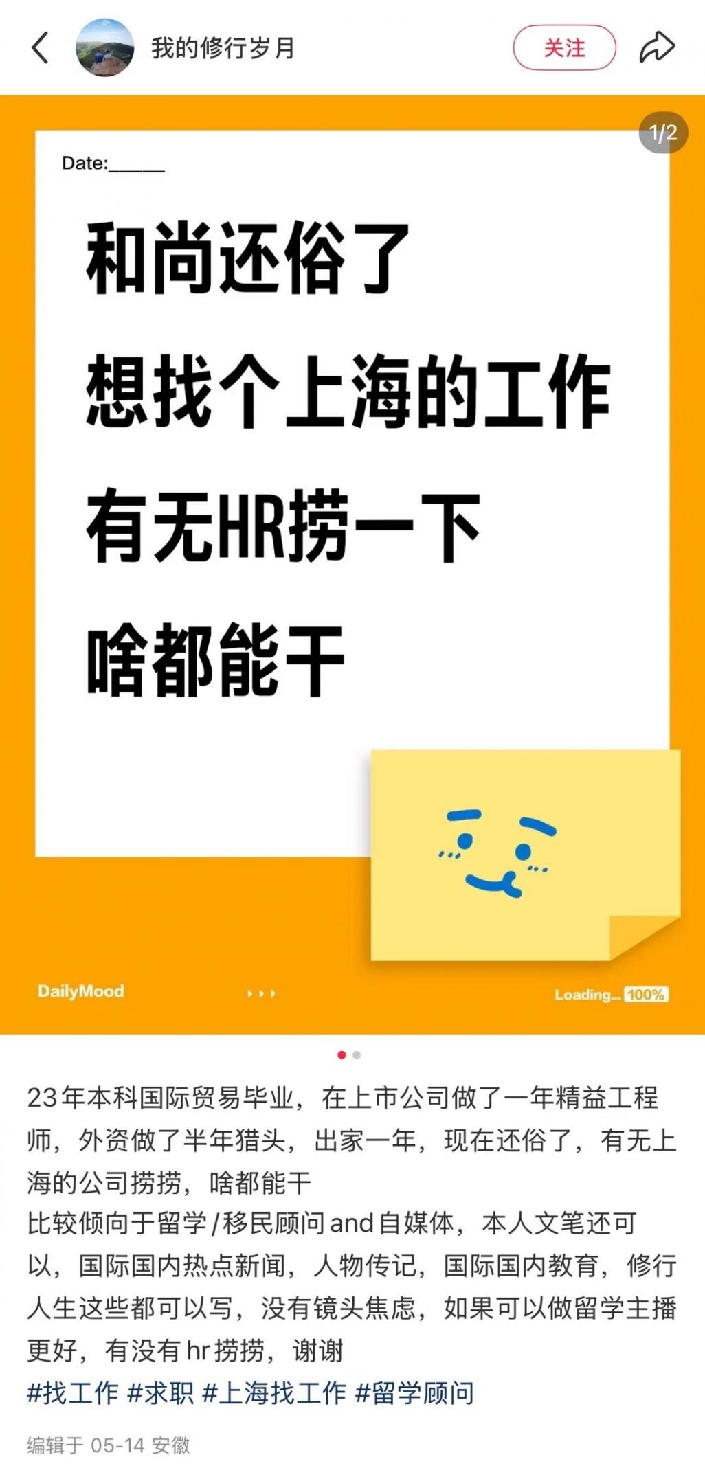 “2023年本科國際貿易畢業,在上市公司做了一年精益工程師,外資做了半年獵頭,出家一年,現在還俗了,有無上海的公司撈撈,啥都能干。”