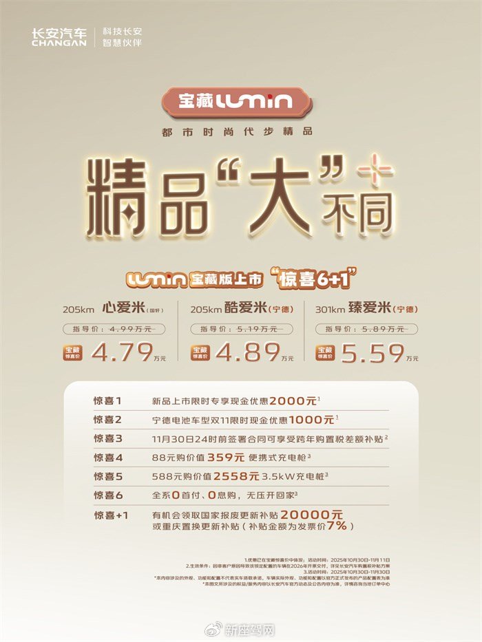 10月30日,都市時(shí)尚代步精品,Lumin寶藏版正式上市,共推出心愛(ài)米、酷愛(ài)米、臻愛(ài)米三個(gè)配置,官方驚喜價(jià)4.79萬(wàn)-5.59萬(wàn)。為回饋用戶,Lumin同步推出極具誠(chéng)意的“驚喜6+1”大禮,購(gòu)車門(mén)檻大幅降低。