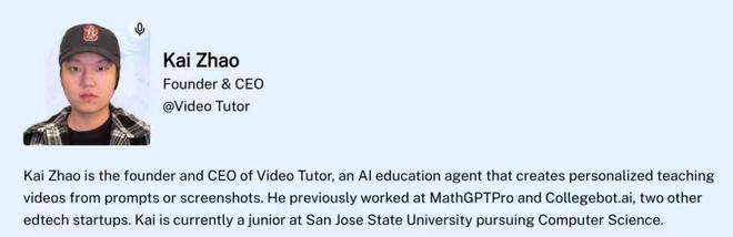VideoTutor由華人大三學生趙凱(Kai Zhao)創立,目前團隊共6人。CTO James Zhan曾在Google Gemini項目組擔任核心AI工程師,與趙凱同校并從大一開始合作創業。