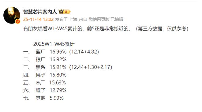 第六:榮耀,市場份額12.79%。這就是國內2025年前45周累計的排名情況,至于全年是不是這個排名真的不好說,畢竟還有好幾周的時間。