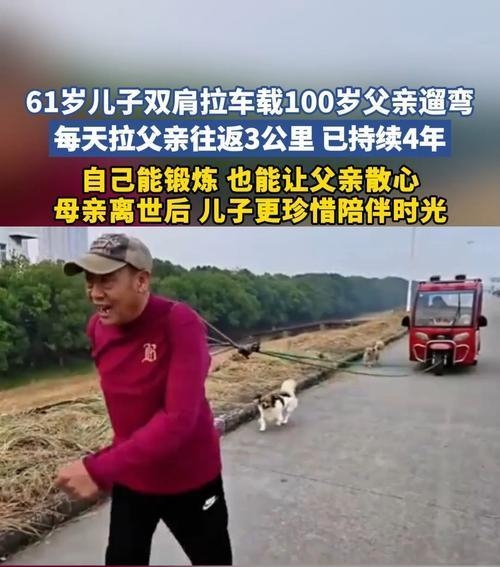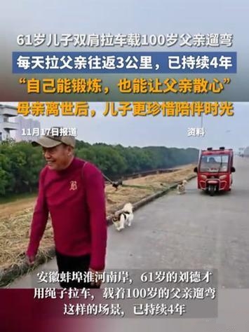 清晨5:30的淮河堤壩,61歲的劉德才正在給三輪車綁防滑鏈。后座加裝的藤椅上,百歲老父親像個期待春游的孩子,反復整理著褪色的中山裝領口。"爹,今天咱去看新開的荷花!"發動機的轟鳴聲中,藏著這對父子延續1460天的秘密儀式。