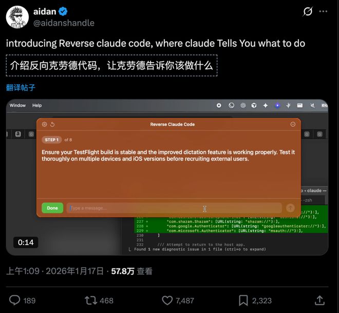 2026年1月17日,Midjourney的一位工程師在X上發布了一段視頻,標題是「Reverse Claude Code」。